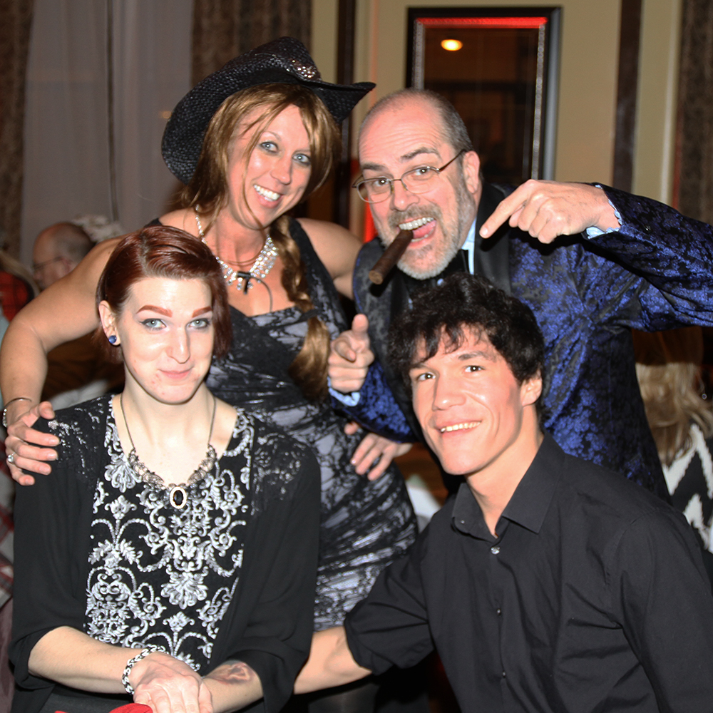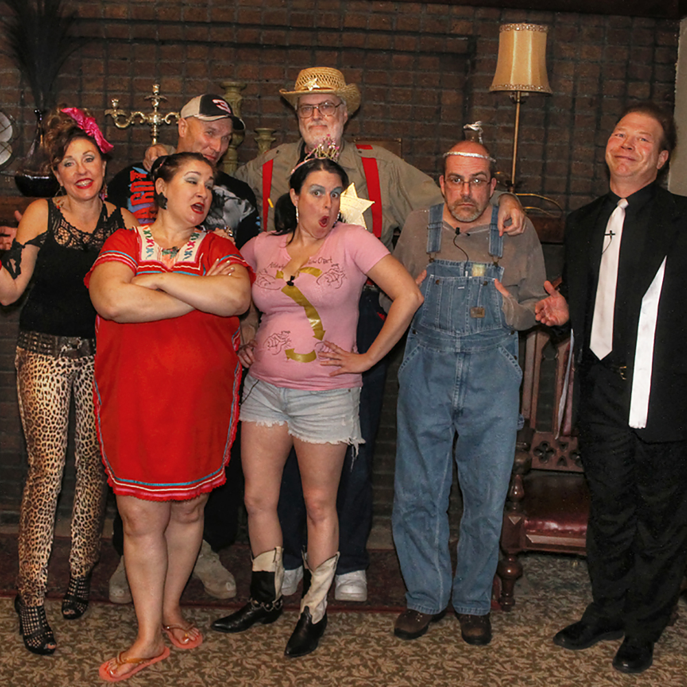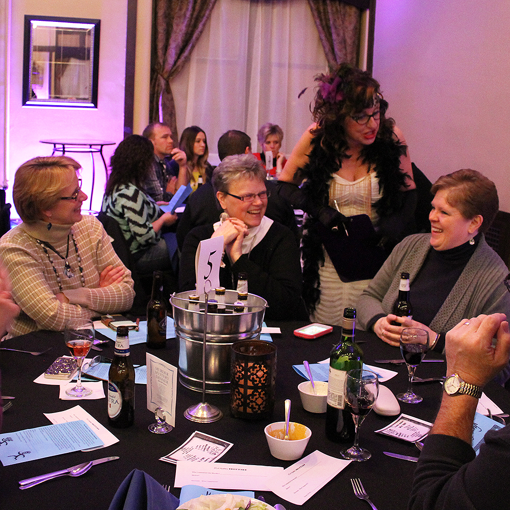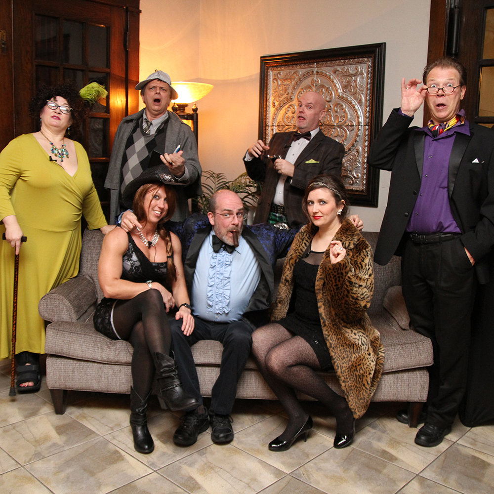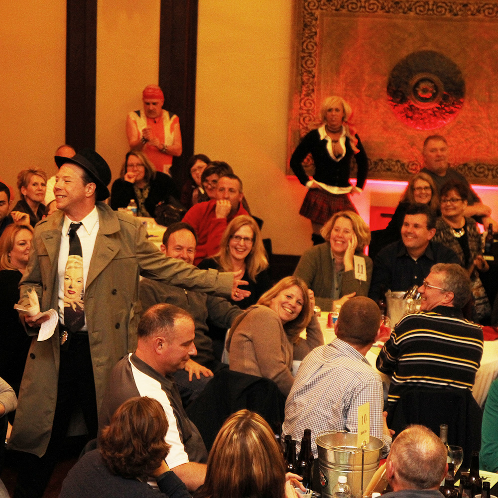 A: Our show plays out in 3 acts, typically, over dinner. During salads or cocktails, rumor and innuendo abound as our characters mingle and meet your guests.